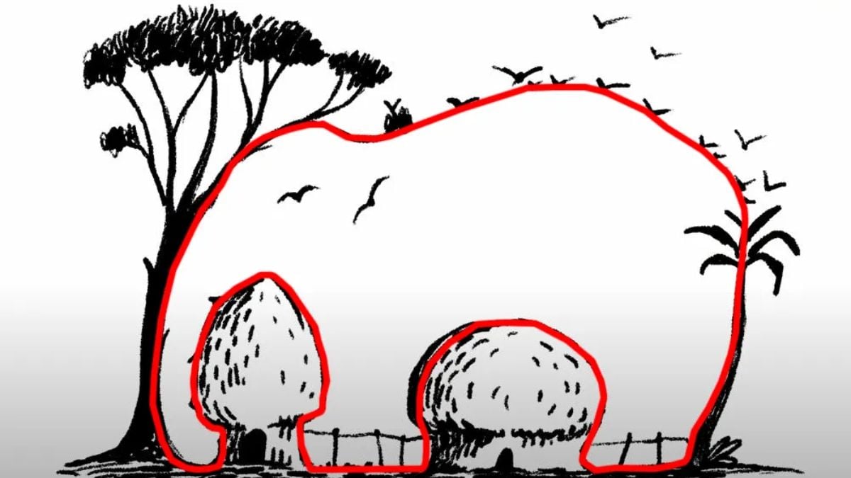 A rajz fákat, füvet és sziklákat ábrázol – minden hétköznapinak tűnik, amíg nem kezded el jobban megnézni. Az elefánt körvonala ügyesen rejtőzik a részletekben: az árnyékokban, az ormányban és az ágak ívében. Ezért van az, hogy a legtöbb ember nem veszi észre azonnal.