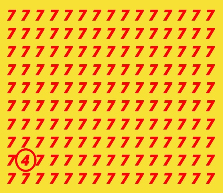 Ez a vírusos vizuális illúzióval készült IQ-teszt világszerte a tarkójukat vakargatja az embereknek. Egy egyszerű, egyenlő számokat tartalmazó 7-es rácsban elrejtve a 4-es szám van. A feladatod az, hogy 7 másodperc alatt megtaláld.