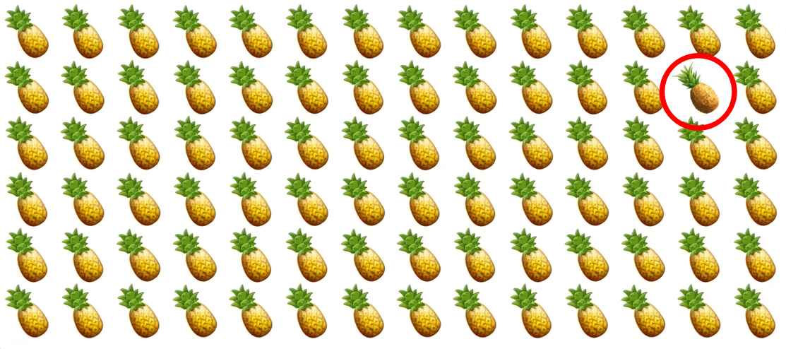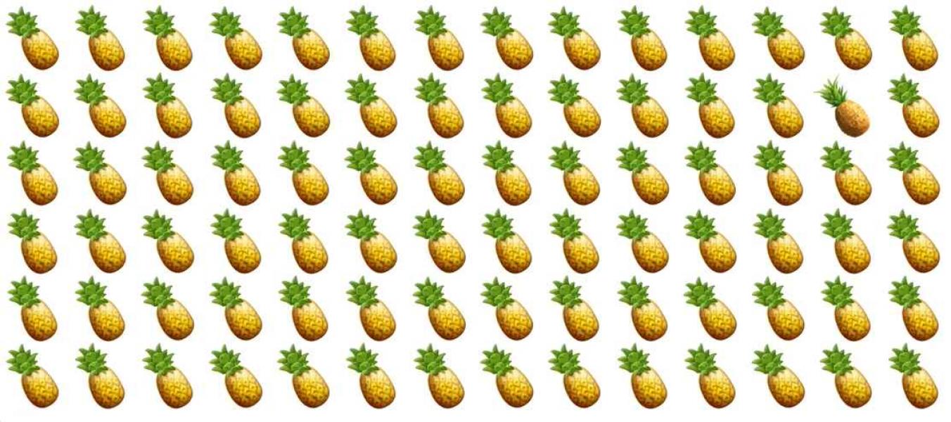 Oldj meg egy egyszerű, de nagyon trükkös feladványt – egy különleges ananászt kell megtalálnod, amely különbözik a képen látható összes ananásztól.